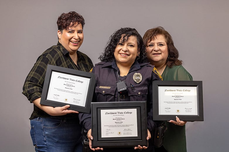 - Triple Triumph: Family Support Equals Success for Three NVC GraduatesIf someone would have told Rebecca Garcia that she would graduate from college 35 years after completing high school, she would not have believed it. She could never have imagined that in 2021, amid a worldwide pandemic, that she and her youngest daughter, Monica Garcia, would both graduate from Northwest Vista College. Cheering for them on their special day was Rebecca’s husband, Richard Garcia, and their eldest daughter, Desiree Garcia, who is also a NVC graduate. As Northwest Vista College celebrates its 30th anniversary this year, we’re reconnecting with alumni and discovering how receiving a degree or certificate from NVC has impacted their lives and careers. Despite the distinct challenges that all three members of the close-knit Garcia family faced, all of them said NVC provided the motivation they needed to achieve their goals. Desiree was the first in the Garcia family to go to college and chose NVC. She graduated from NVC in 2013 with an Associate of Arts in Criminal Justice. In 2016, she earned a Bachelor of Arts in Criminal Justice from the University of Texas at San Antonio (UTSA). For Desiree, getting a degree at NVC was the first step toward fulfilling her childhood dream of becoming a police officer. “If it wasn’t for Vista, I wouldn’t have gone to get my bachelor’s degree. I would not have gone into the police academy,” she said. “It all started with Vista giving me a chance.” Today, Desiree proudly serves as a police officer with the Northside Independent School District (NISD) where she's been for nearly six years. Prior to that, she served as an officer with the Live Oak Police Department. Despite her accomplishments, Desiree recalls a time when she had lost her motivation to complete her bachelor’s degree. When her great-grandfather died in 2015, she felt like giving up, but her desire to make him proud, as well as the encouragement from her father, mother and sister, helped her carry on. As it turns out, the Garcias served as a support system for each other, and about a year later, Monica decided to follow her older sister’s advice and enrolled at NVC. Not long after, their mom, Rebecca, who had started at San Antonio College after graduating from high school in 1986, also enrolled at NVC. Rebecca said going back to college after 30 years was both a humbling and eye-opening experience. “I quickly realized that math wasn’t as easy as it used to be. I had to visit the math lab more often than I liked,” Rebecca said. “But the individuals would sit with me in a huddle to make sure I understood everything. It didn’t matter if they were busy or not; they always made me feel welcome and smart, even when I doubted myself.” Rebecca and her youngest daughter, Monica, helped each other with homework and, at the suggestion of their advisor, even took a couple of classes together. Monica said going to school with her mom was a little weird at first, but because of the support they gave each other, it soon felt natural. “What I learned going to Vista is that you’re never too old or too young to go back to school,” Monica said. “There are going to be obstacles along the way, and you can always overcome those obstacles with the right people by your side.” As was the case for Desiree, Monica and Rebecca did not let obstacles stop them from completing their education — not even the COVID-19 pandemic. In May 2021, both were among the pandemic-era, masked-wearing graduates who participated in NVC’s memorable drive-thru commencement ceremony at NISD’s Dub Farris Athletic Stadium Complex. Desiree said she cried like a baby and Richard was also filled with emotion as they watched Rebecca and Monica receive the degrees they had worked so hard to attain. Monica earned an Associate of Arts in Digital Media, and she’s currently working as an accounting clerk for IPAC Nissan in San Antonio. Rebecca received an Associate of Arts in Medical Management. She said graduating from college at 52 was something she never thought would happen, but it gave her confidence and put her on a career path that she’d dreamed of but didn’t think was possible. She’s now the office manager for the Trauma and Emergency Surgery Division for UT Health San Antonio. “It’s a position I take great pride in, and I feel I couldn’t have done it without the help of everyone at Northwest Vista College.” VISIT NVC'S 30 YEAR CELEBRATION WEBPAGE